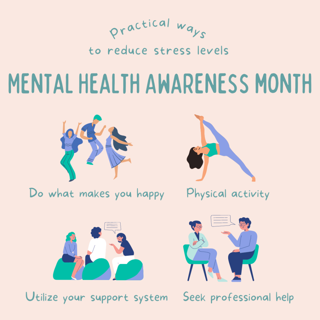 May is recognized as Mental Health Awareness Month in the United States, but mental health should be recognized everyday around the world. There has been stigma surrounding mental health around the world. As more and more people are willing to talk openly about mental health, it has helped reduce the stigma to promote helpful resources and steps to live a healthier life. It is imperative that we continue to talk openly about mental health awareness in hopes to normalize mental health and promote overall wellbeing. Here are some helpful tips to consider during mental health awareness month, to help lead to a healthier lifestyle: