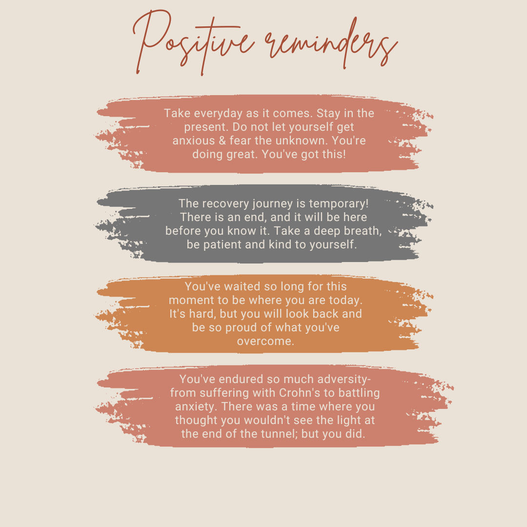 - Changing your mindset from negative thoughts to positive will help you relieve overwhelming emotional distress and reduce physical pain. If your mind is impacted by stress, then your body (muscles, joints, bones) will experience more physical pain and discomfort. The mind truly helps your body heal, so it’s important to try to keep a positive mindset during the recovery phase. One way to do this is through journaling and positive affirmations. Here are some positive reminders I wrote for myself that can be relatable- I had to create a graphic because my handwriting is barely legible. 😂